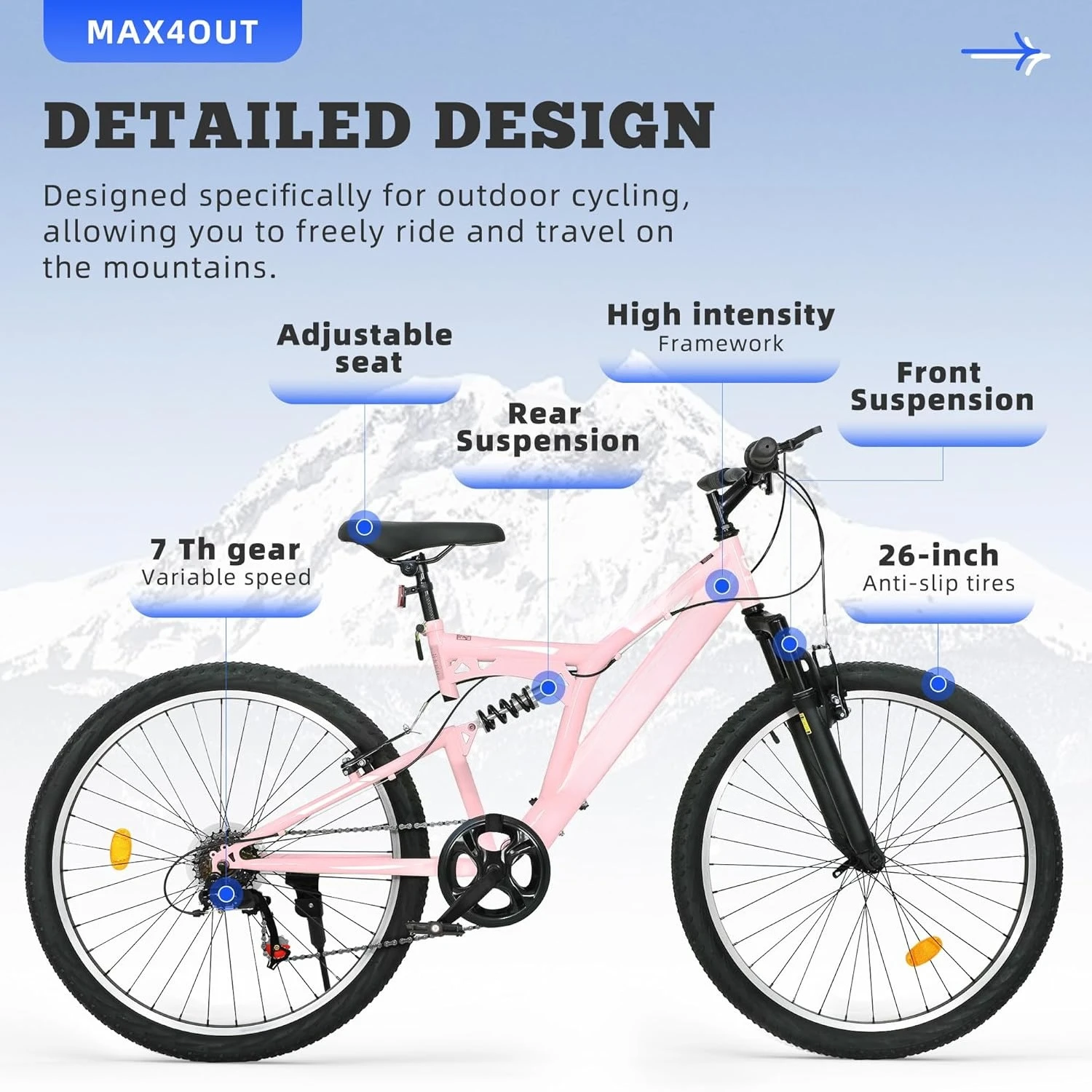 [Tires & Fit] Master all terrains! The 26" all-terrain tires provide superior traction while the adjustable frame fits riders from 5'2" to 6'2" perfectly.