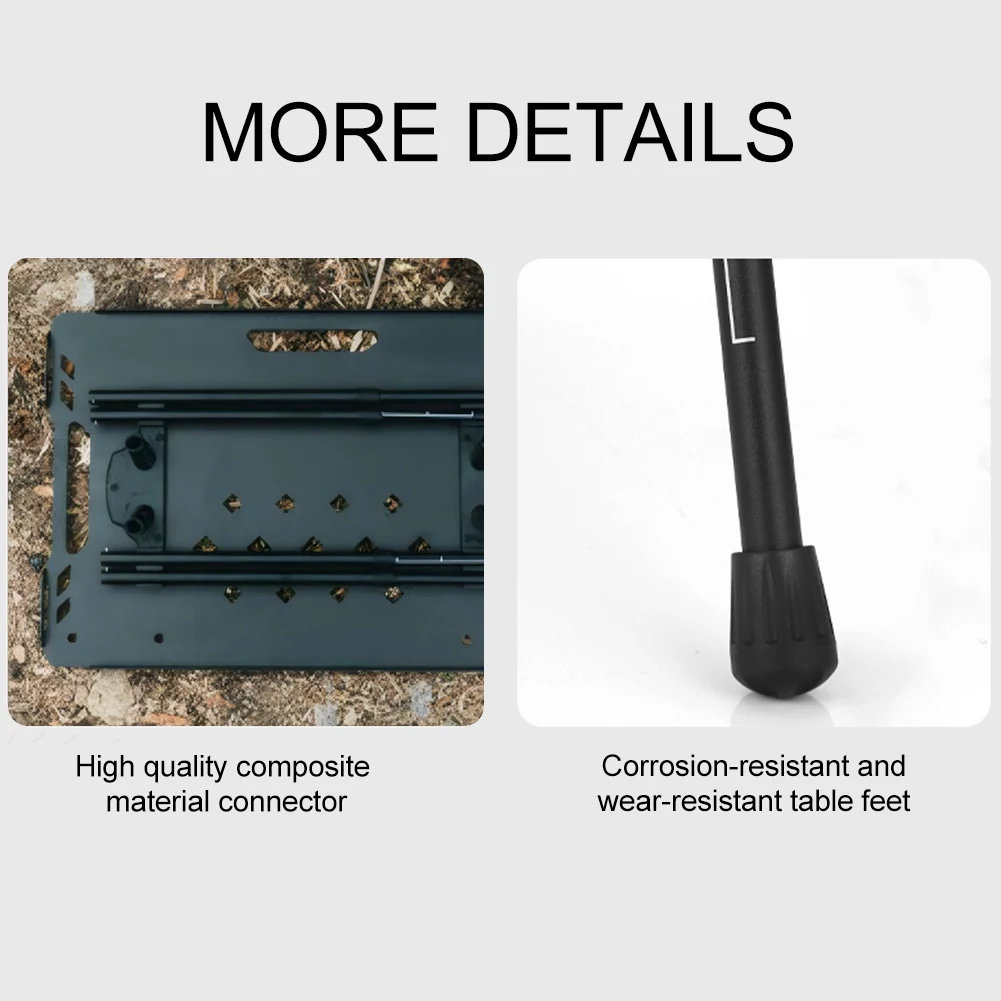 3. Adjustable Height: The workbench legs are designed with adjustable height, ranging from 16.93 inches to 24.41 inches. This allows for easy customization to accommodate different terrains or preferences, ensuring a comfortable working or dining experience.