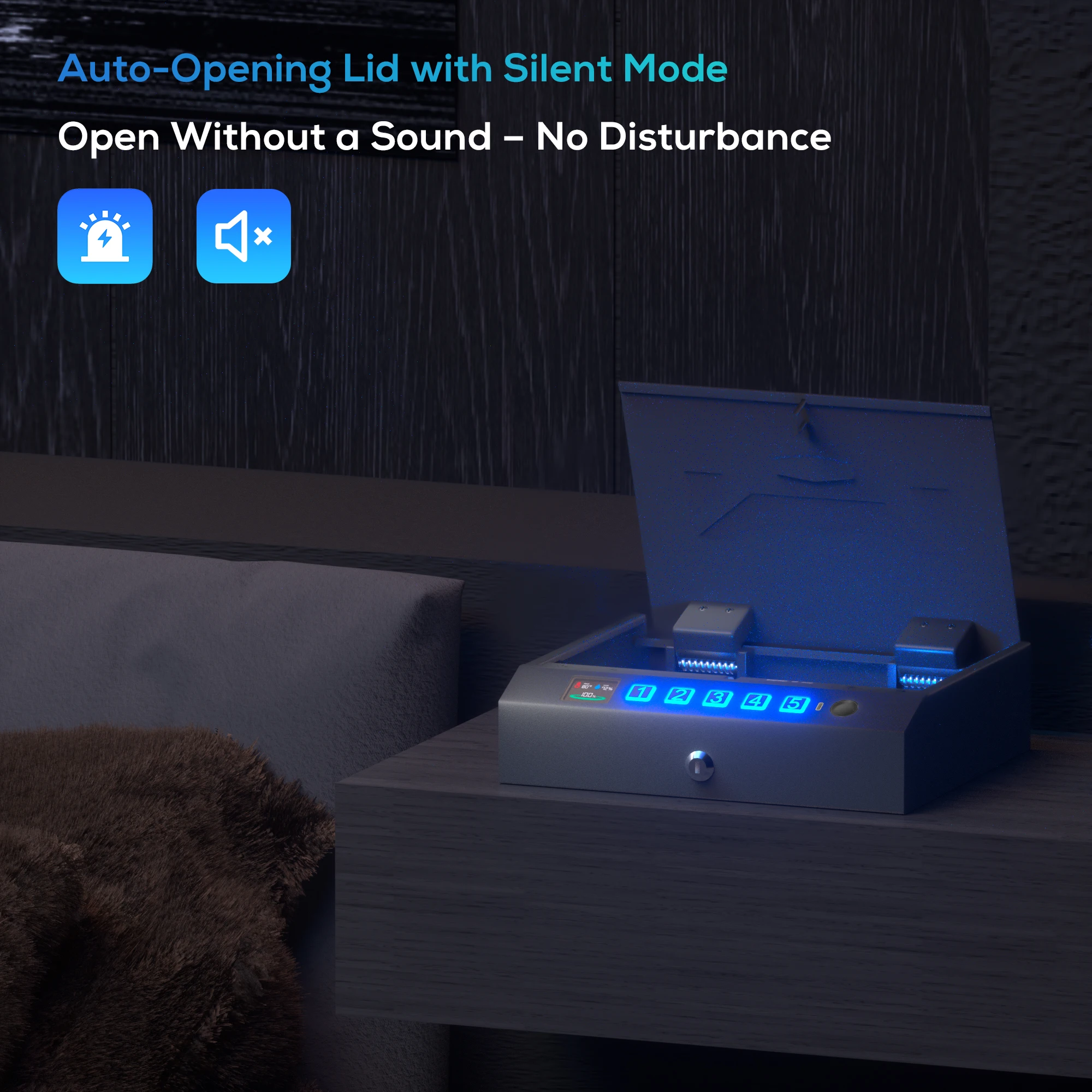 LED & Mute & Anti-theft Rope : Equipped with LED interior lighting, the biometric handgun safe improves nighttime visibility, while the 360° sponge wrap prevents scratches from vibration. Silent mode makes it perfect for use as a bedside table firearm safe. The pistol safe also includes two screw holes for easy installation on nightstands or in drawers, and the included steel cable provides added security against theft when stored in a vehicle