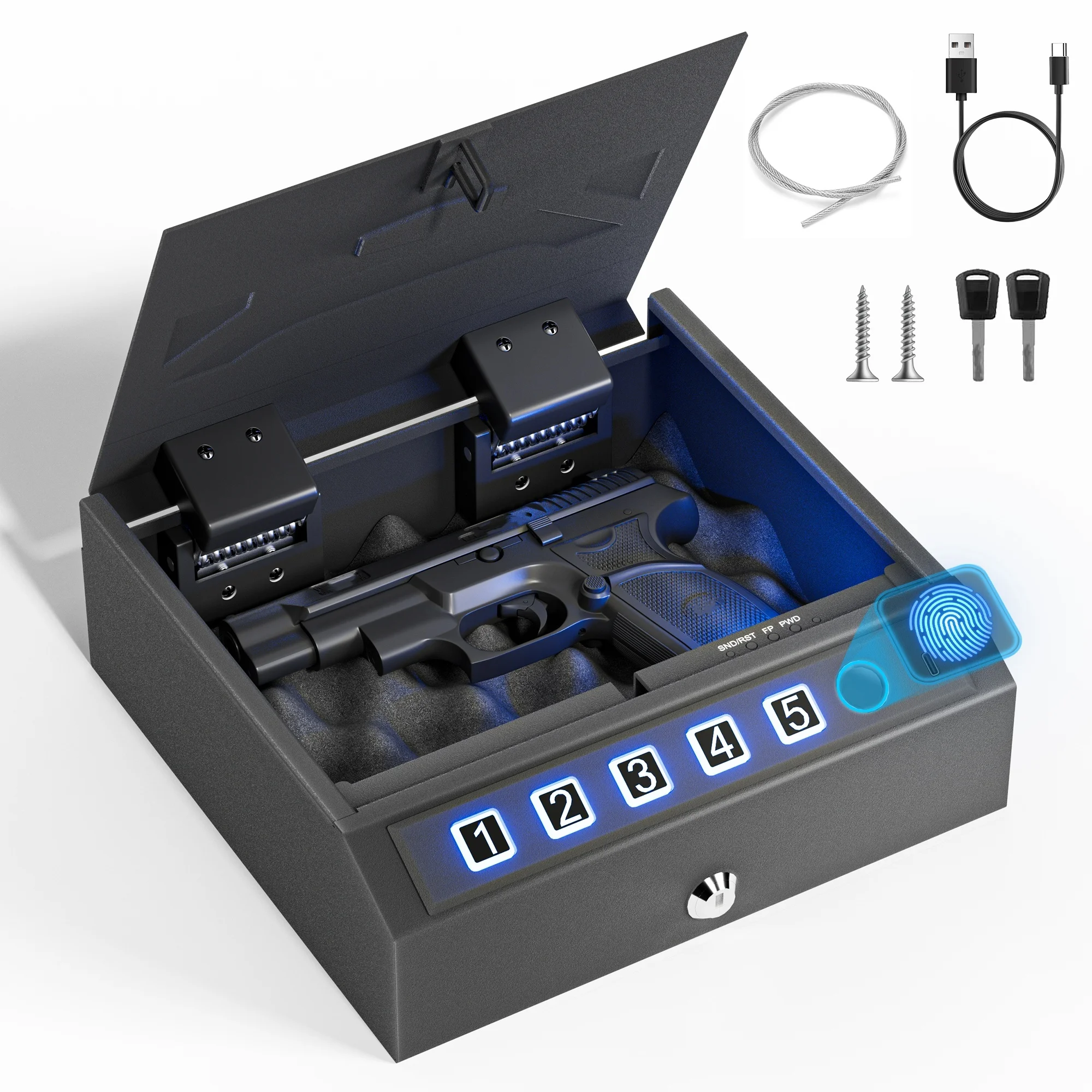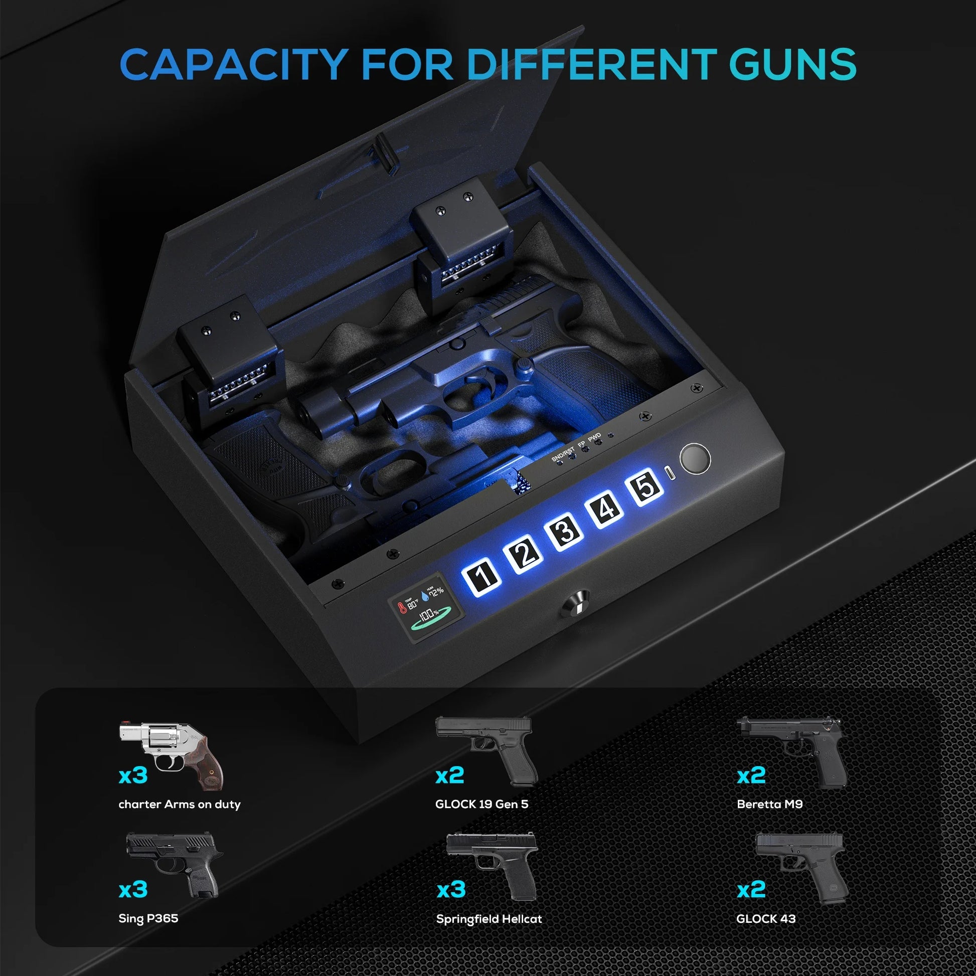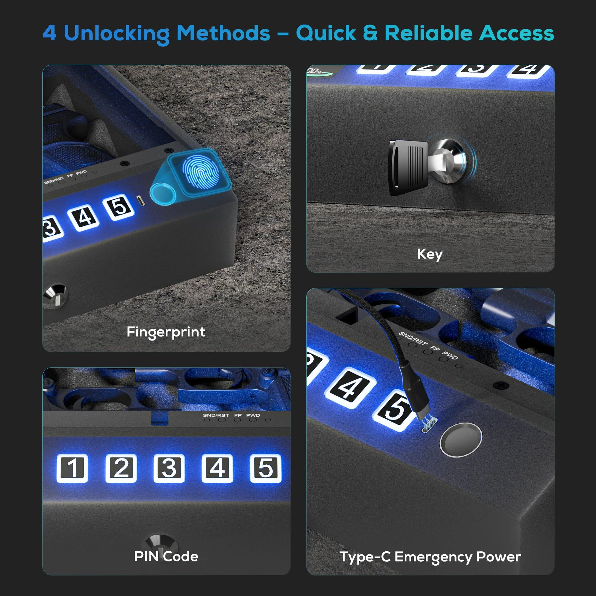 4 Security Entry Methods: The Pistol Safe features 4 security entry methods to protect your guns and valuables: Fingerprint, 5-digit Keypad, Backup Key and Type-C Port. With fingerprint unlock, you can open the gun safe in 0.1 seconds, and no one has the right to open the safe by fingerprint before setting it up. Up to 60 fingerprint scans can be stored.